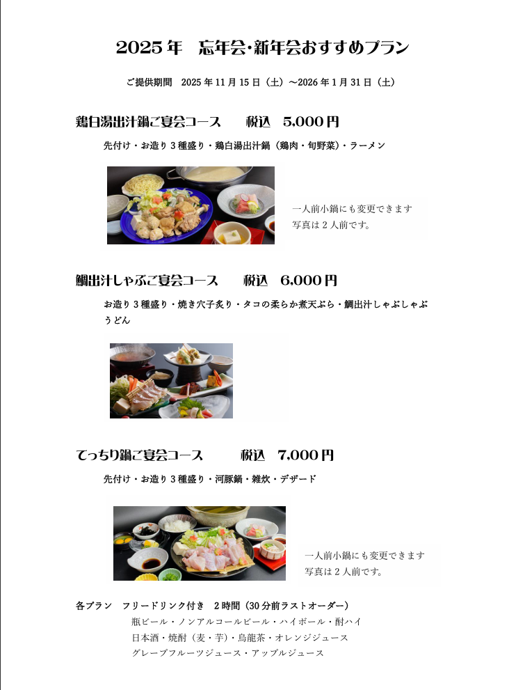 今年は飲み放題付のご会食プランをご用意いたしました。